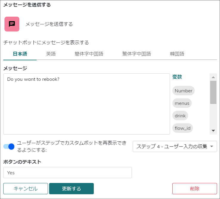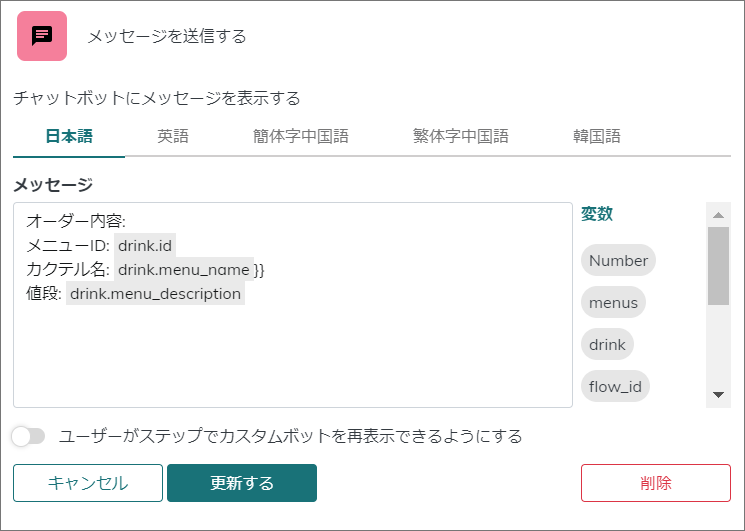 変数はメッセージの右側に表示されているものをドラック＆ドロップする事で利用可能です。