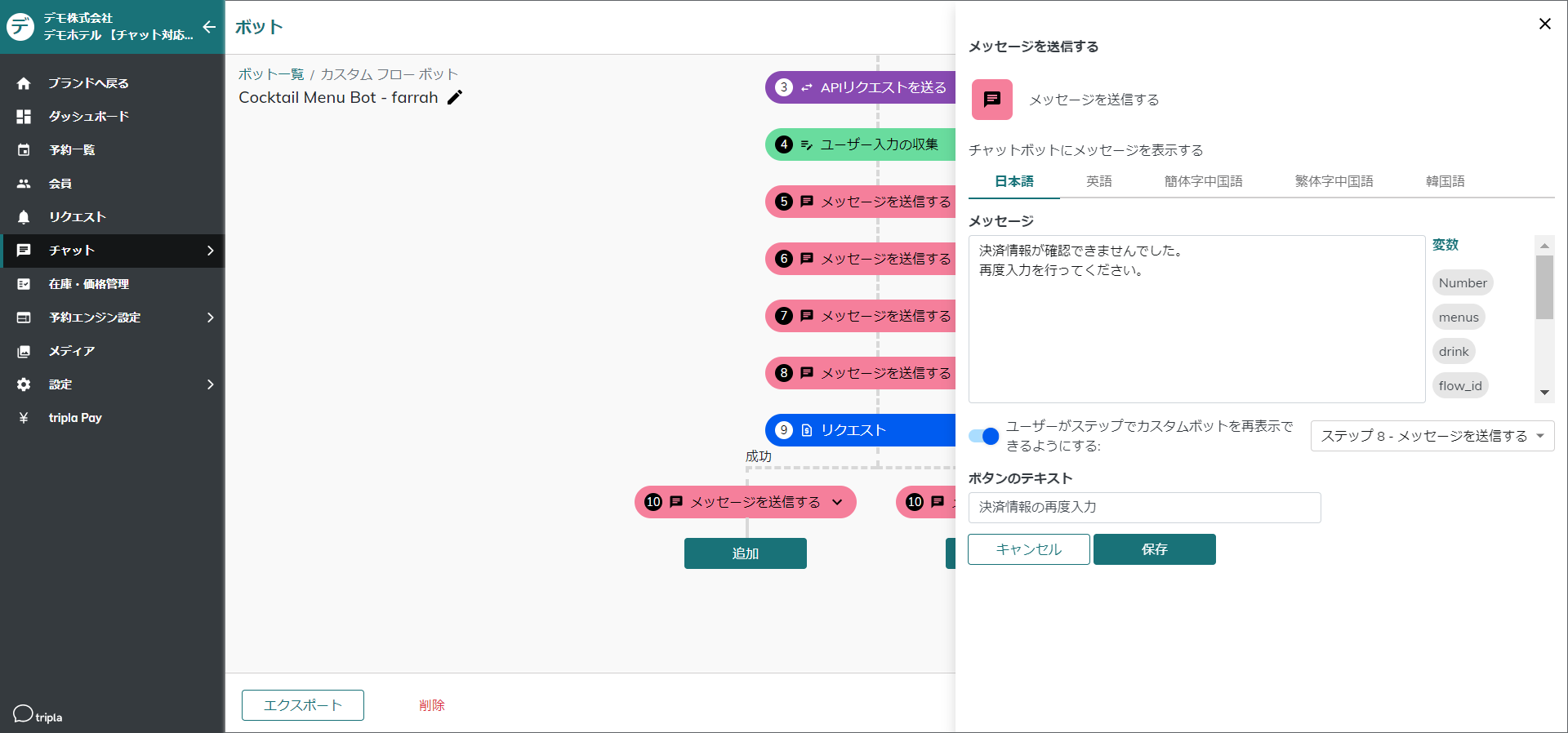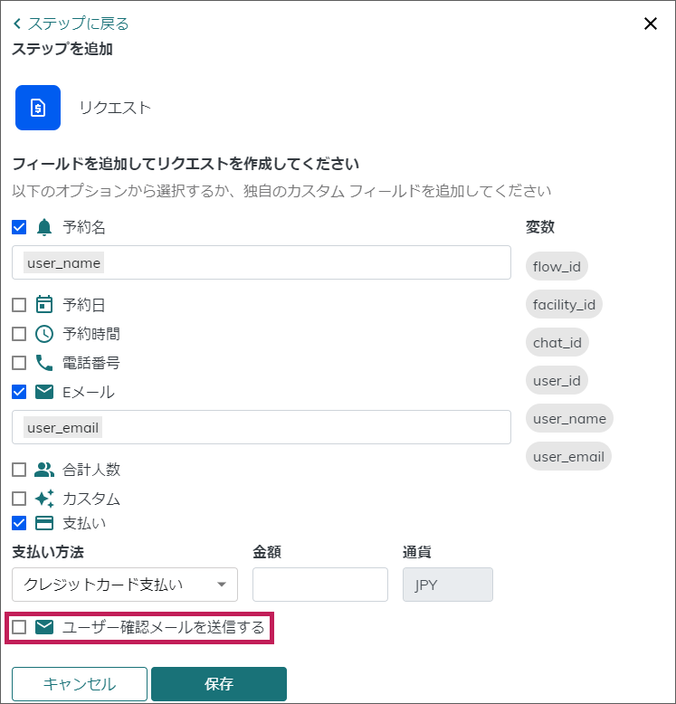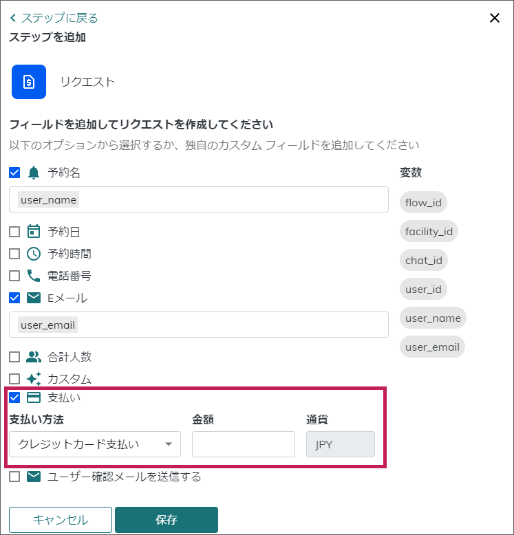 決済が失敗した場合、今一度入力が可能なように、\[ユーザーがステップでカスタムボットを再表示できるようにする]をONにし、リクエストの前に作成したメッセージへ戻る様設定します。
