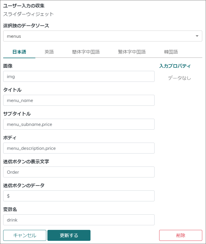 | 選択肢のデータソース      | 先程Googleスプレッドシートで作成した変数     |