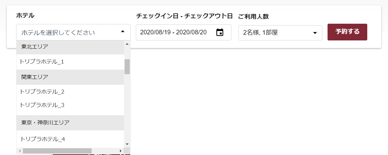 チェーンホテルのブランドTOPページに設置する検索バーでエリア検索が可能になります。