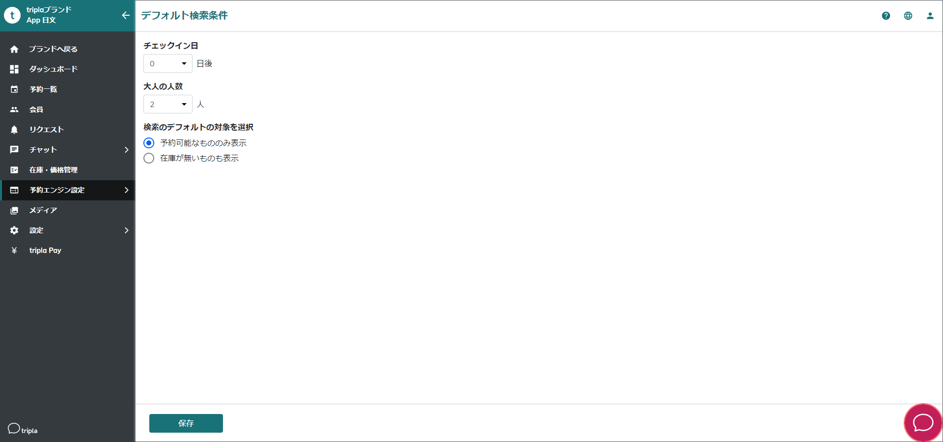 ![](https://1903552031-files.gitbook.io/~/files/v0/b/gitbook-legacy-files/o/assets%2F-LL8Fdh0JdNEoueN5USH%2F-M_5ITeBNgm6a095QqHF%2F-M_Io9L7kN4iLqO2VuP4%2F%E4%BA%88%E7%B4%84%E3%82%A8%E3%83%B3%E3%82%B8%E3%83%B3%E8%A8%AD%E5%AE%9A%E3%80%80%E3%83%87%E3%83%95%E3%82%A9%E3%83%AB%E3%83%88%E6%A4%9C%E7%B4%A2%E6%9D%A1%E4%BB%B6.png?alt=media\&token=cc962d34-cc8b-42ef-9e09-9481cfe5718c)